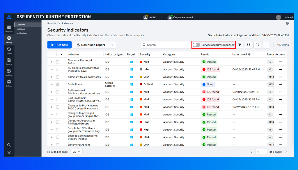 DSP provides continuous security vulnerability assessment across your on-prem and hybrid AD environment, scanning for hundreds of Indicators of Exposure (IOEs) and compromise (IOCs) across various categories of AD security, including account security, Group Policy, Kerberos, AD delegation, AD infrastructure, and Entra ID. DSP provides a dashboard of the overall security posture score, category scores, security indicators grouped by severity, and prioritized remediation guidance from AD security experts.