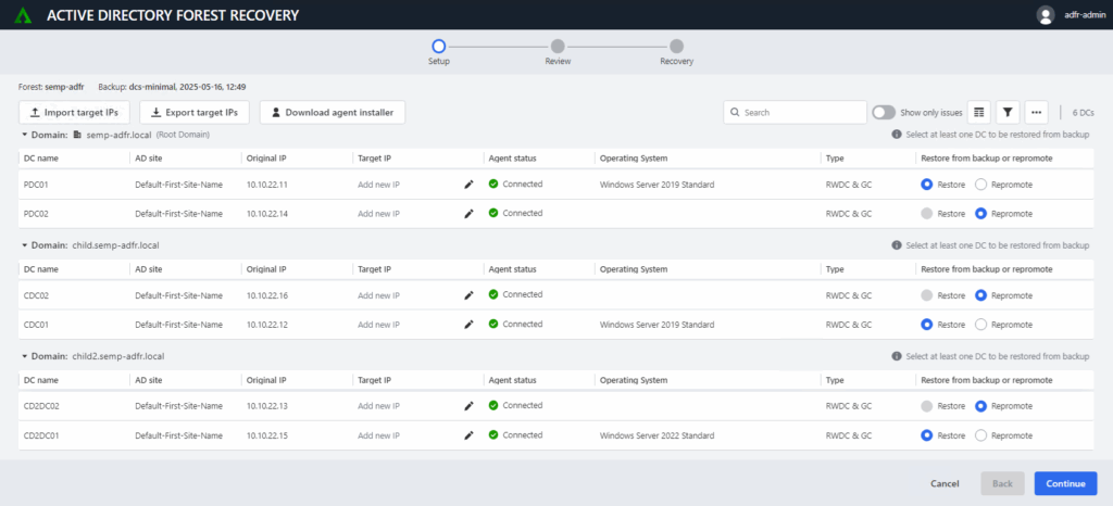Fault-tolerant recovery starts with flexible protection, ensuring the ability to recover all domain controllers (DCs)—even those not explicitly selected for backup. Semperis Active Directory Forest Recovery (ADFR) regularly monitors AD and updates the forest topology, enabling the recovery of non-backed-up DCs (Figure 1).