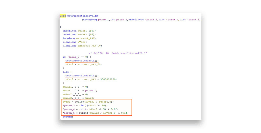 GetPasswordBasedOnTimestamp functionThis brings us to one of the most significant observations of our research. The L0, L1, and L2 values are generated in GetIntervalID(), then passed to GetKey() when constructing a new key BLOB (Figure 18).