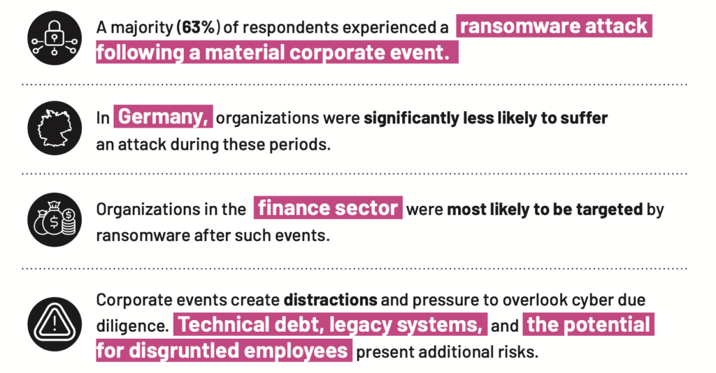 Les changements de direction et de personnel, les intégrations de systèmes et les fusions créent des vulnérabilités. Les périodes de bouleversement de l'entreprise - qu'il s'agisse d'une fusion, d'une acquisition, d'une introduction en bourse ou d'une réduction des effectifs - sont également des aimants pour les auteurs d'attaques par ransomware. Les données de l'enquête Semperis montrent que la majorité (63 %) des personnes interrogées ont également subi une attaque de ransomware à la suite d'un événement important pour l'entreprise. Non seulement ces situations créent des distractions que les mauvais acteurs aiment exploiter, mais les attaquants peuvent souvent obtenir des rançons importantes de la part d'entreprises désespérées de retrouver l'accès à des systèmes critiques ou de prouver leur compétence opérationnelle avant une transaction majeure. En outre, ces événements posent des défis inhérents à la sécurité de l'identité.