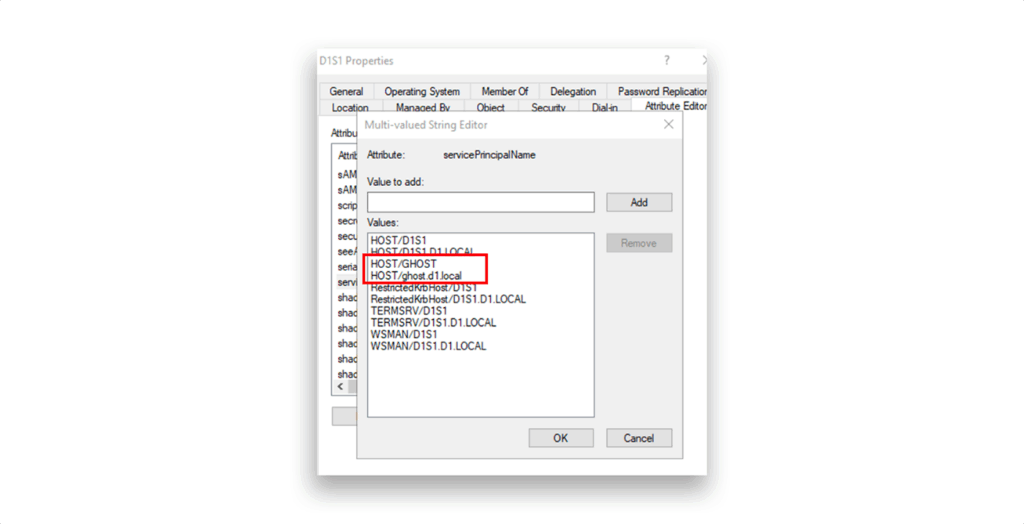 Ad esempio, la Figura 1 mostra un account del computer D1S1 con un SPN denominato GHOST.