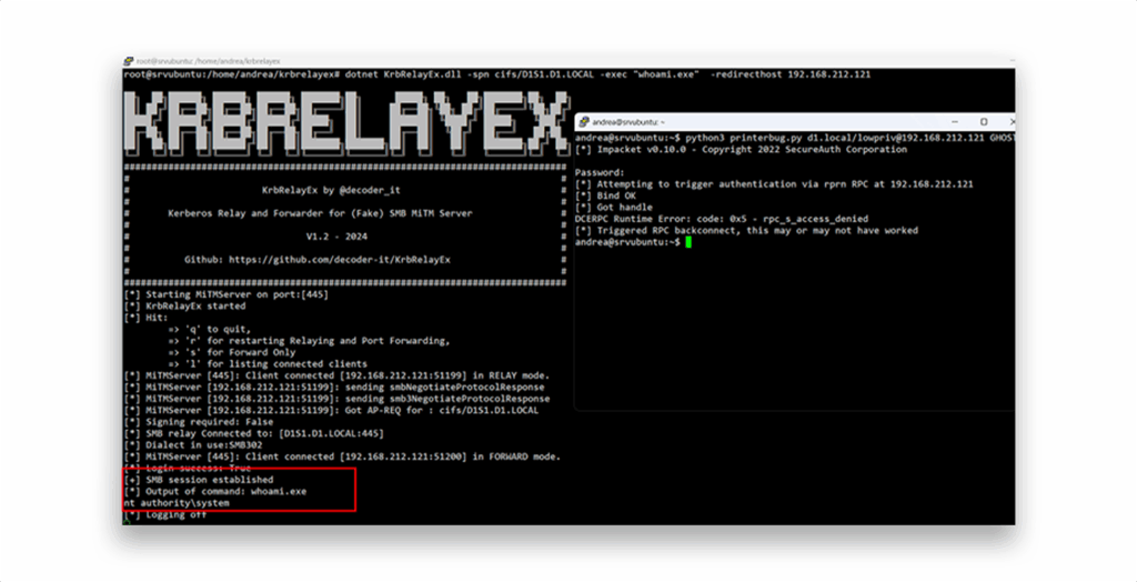 Figura 5 mostra un esempio di attacco. In questo esempio, l'aggressore costringe l'host di destinazione a eseguire l'autenticazione della macchina attraverso il Print Spooler (PrinterBug). L'ascoltatore SMB del relay Kerberos intercetta l'AP-REQ e riproduce il ticket al servizio di destinazione, consentendo l'autenticazione come account macchina e l'esecuzione remota di comandi con privilegi SYSTEM.