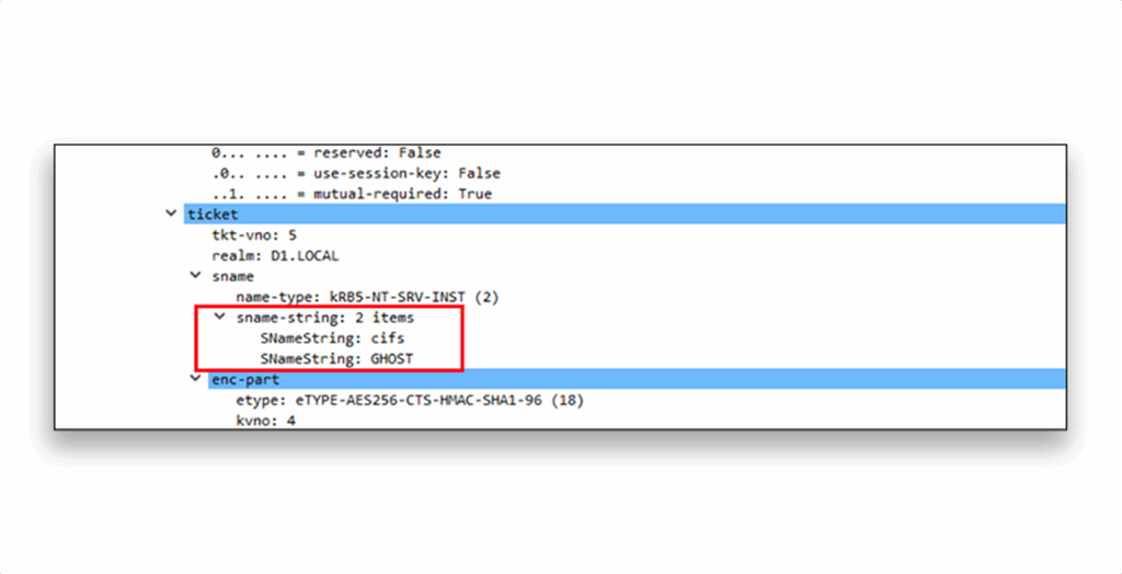 Nell'acquisizione della rete, si può notare che è stato richiesto un TGS/AP-REQ per SPN CIFS/GHOST (Figura 6).