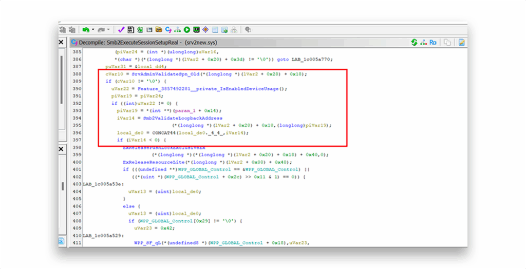 In particolare, il driver accetta un pacchetto SMB che contiene un blob Kerberos, estrae il buffer di sicurezza incorporato, lo invia al Local Security Authority Subsystem Service (LSASS) tramite l'API Security Support Provider Interface (SSPI), riceve un token di risposta e quindi impersona il client di origine utilizzando tale token.
