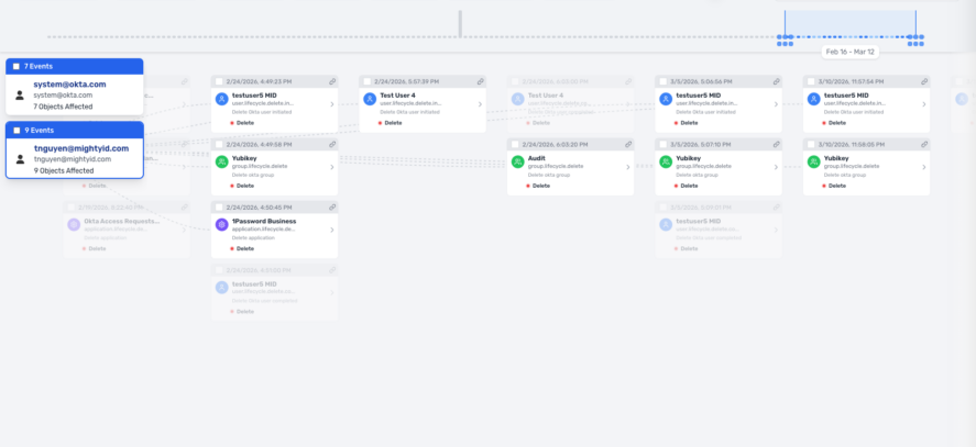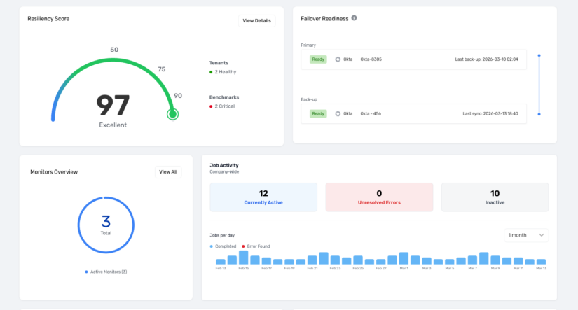 The environment overview in Recovery for Okta shows the overall system health, plus key stats on IDP status, current resilience score, change velocity, and current tenant connection status. Semperis Recovery for Okta enables full and incremental backups of IDP tenants, granular restores, and rapid recovery from corruption or attack, supporting both same-IDP and cross-IDP scenarios.